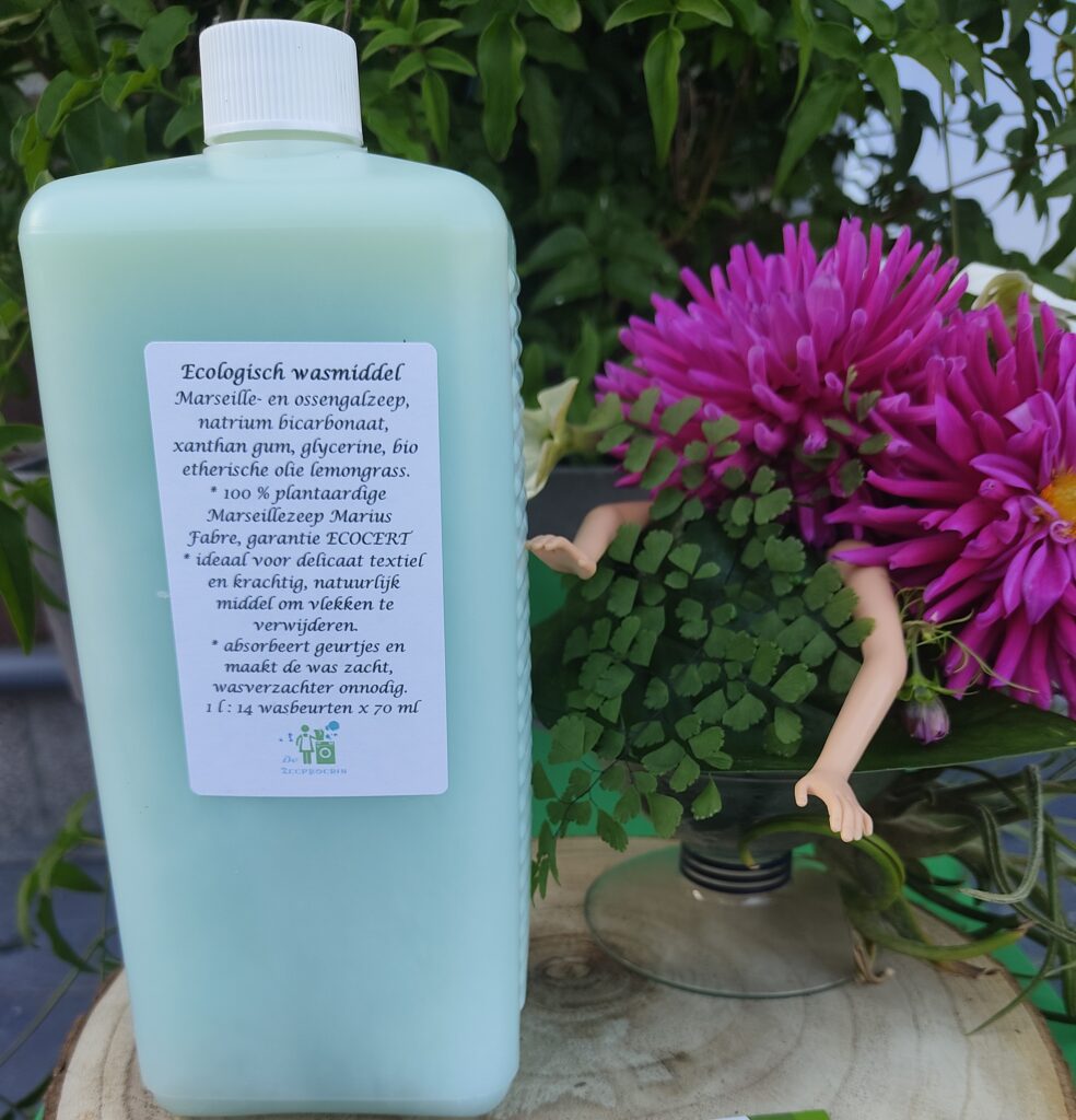 Ingrediënten: Gedemineraliseerd water, 100% plantaardige ecologische Marseillezeep Marius Fabre, ossengalzeep en natriumbicarbonaat, xanthan gum, plantaardige glycerine, verrijkt met exotische en frisse geuraccenten van bio etherische olie lemongrass. Of puur – voor babykleding bijvoorbeeld.